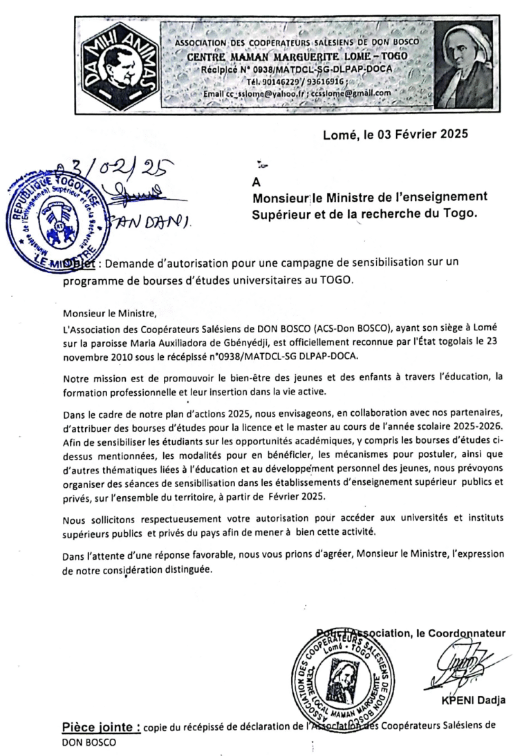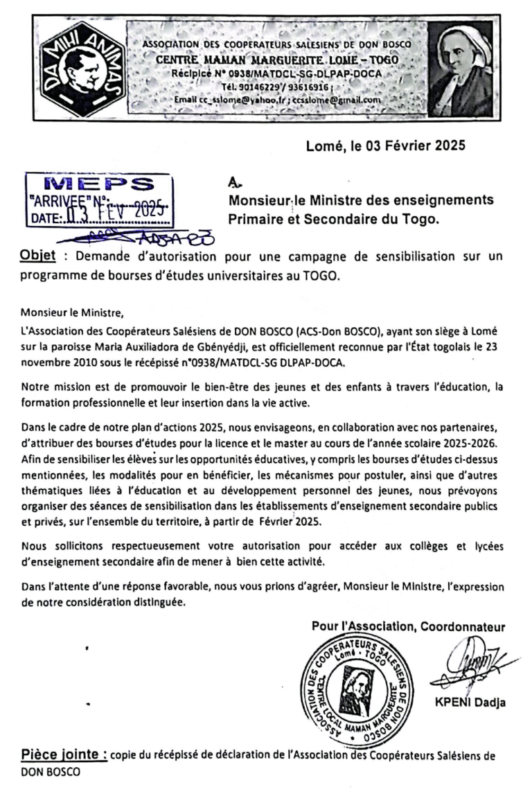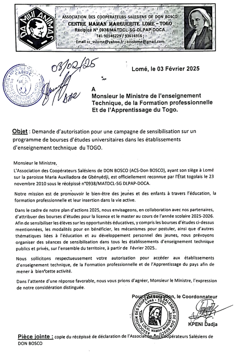 Dans le cadre du lancement des Bourses d’Excellence FAA – PointsForChange, financées par le joueur de tennis Félix Auger‑Aliassime et BNP Paribas et Cogérées par la Fondation Roi Baudoin et l’Association des Coopérateurs Salésiens de Don Bosco, nous avons souhaité inscrire cette initiative dans une démarche de transparence et de collaboration avec les institutions éducatives du Togo.